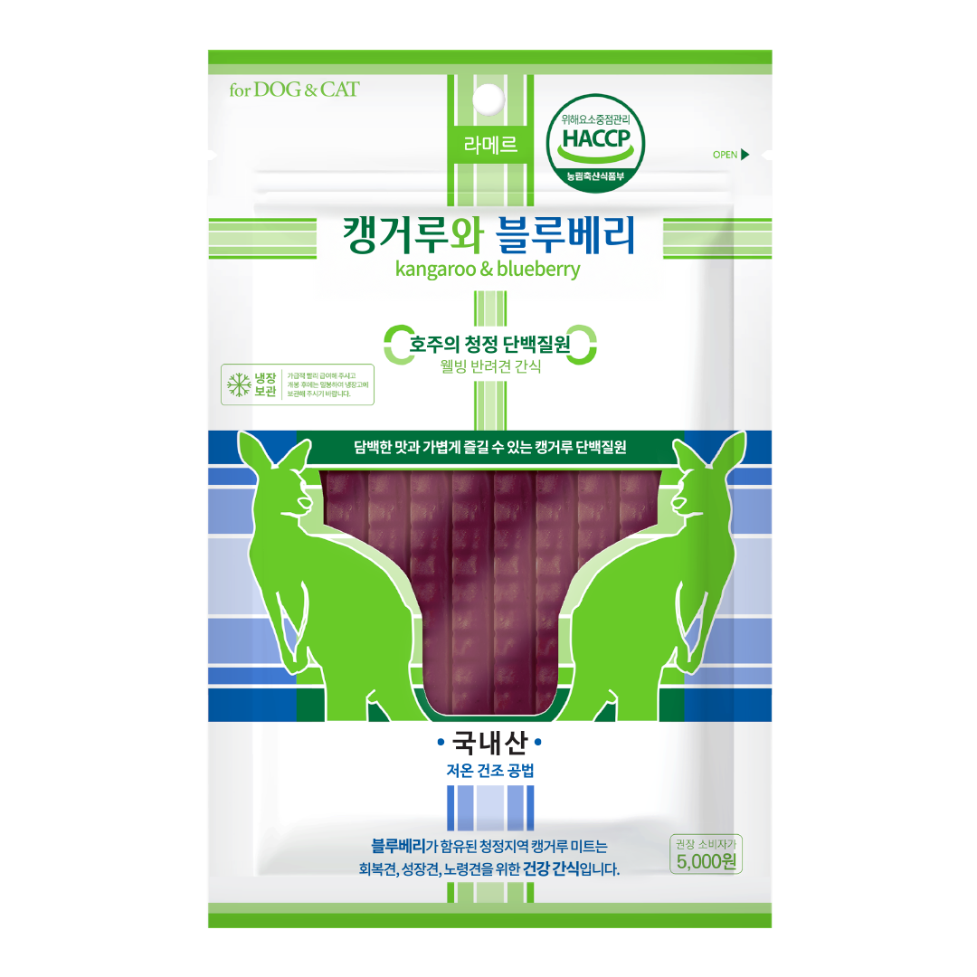 Kangaroo meat, white fish, corn starch (Non-GMO), blueberry, D-Sorbitol, calcium, oligosaccharides, Vitamin E, flaxseed, water-soluble magnesium calcium, water-soluble silkworm oil powder